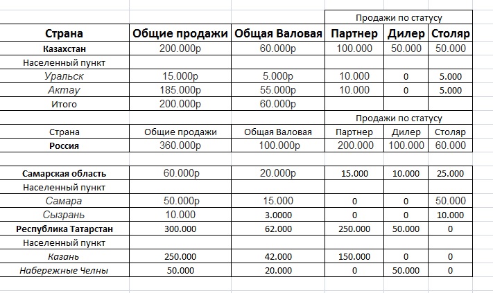 3. Сделать отчет по регионам как во вложении. В отчете должна быть возможность формировать его с отбором по : стране, фирме, складу, региону, городу, статусу контрагента за произвольный период.