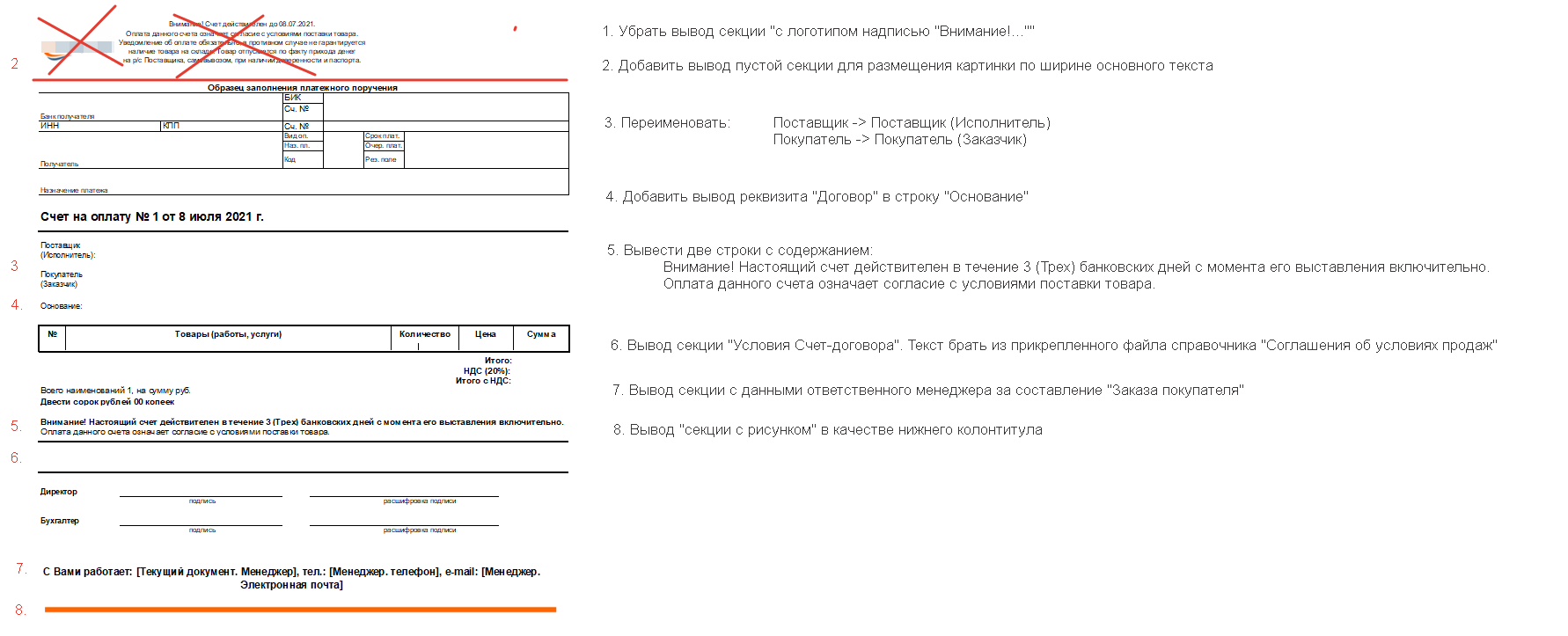 В типовую печатную форму "Счет на оплату" (документ "Заказ покупателя") внести следующие изменения:
