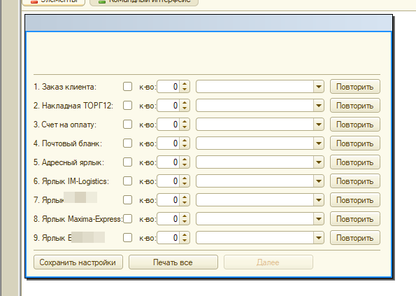 Есть обработка, автоматизирующая работу комплектовщика заказов. После сборки заказа обработка показывает список спечатных форм для печати (накладные, ярлыки). Около каждой печатной формы стоит галочка и список выбора принтера для печати. Внизу формы кнопка Печатать все, по нажатию на которую выбранные галочками формы печатаются на выбранных принтерах. Настройки галочек и принтеров сохраняются в зависимости от способа доставки скомплектованного заказа (указано в допсвойствах заказа клиента). Все это работает.