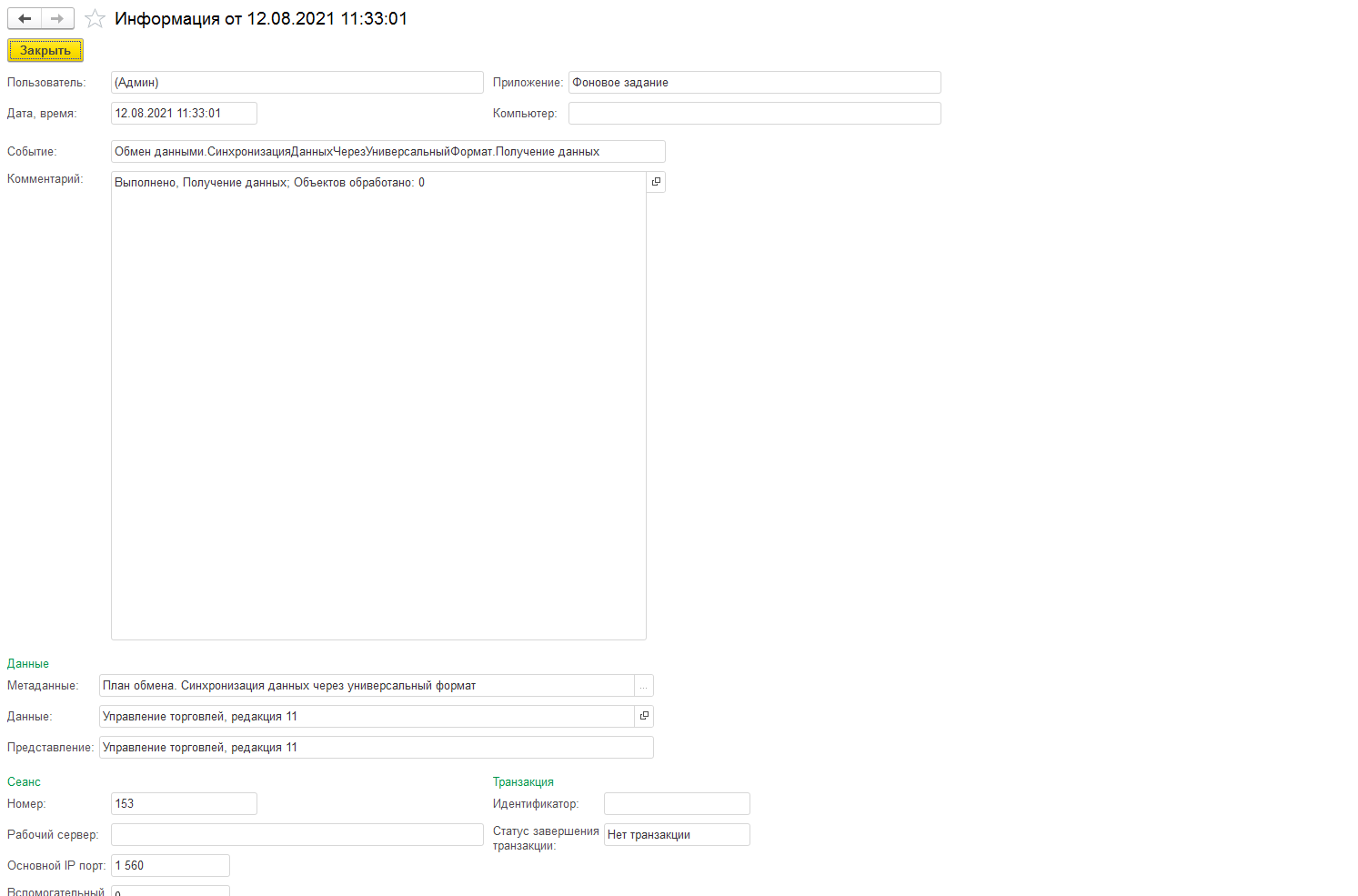 Обмен был реализован по принципу: Выгружается только используемая нормативно-справочная информация из УТ в БУХ. Обратный обмен отключен, так как весь учет ведется в УТ. Обмен настроен через сетевой каталог. Из УТ данные регистрируются к обмену ( и кажись даже выгружаются), но в БУХ они не принимаются. Никаких предупреждений не выводится. При просмотре журнала регистрации выходит сообщение что «нет транзакции».