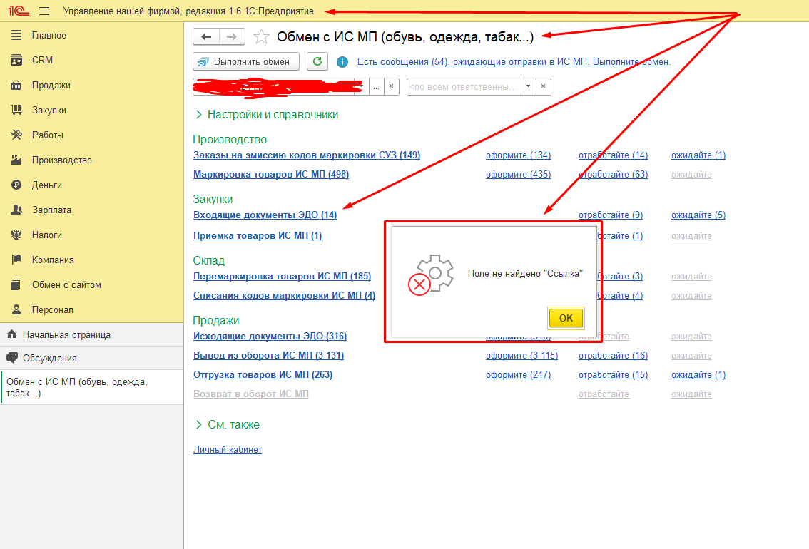 УНФ 1.6, компания производит, продает маркированный товар, текстиль. У одного пользователя при попытке зайти в раздел обмена ИС МП - закупки - входящие документы, выходит ошибка ( Поле не найдено "Сылка" )