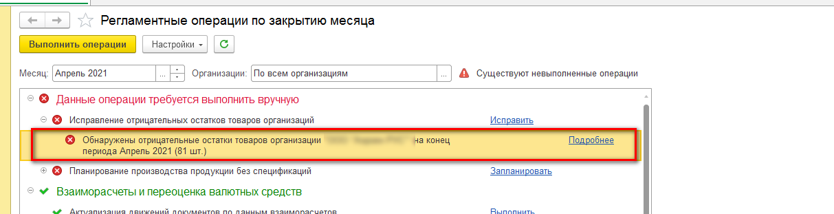 Разобраться с причиной отрицательных остатков в 1C ERP