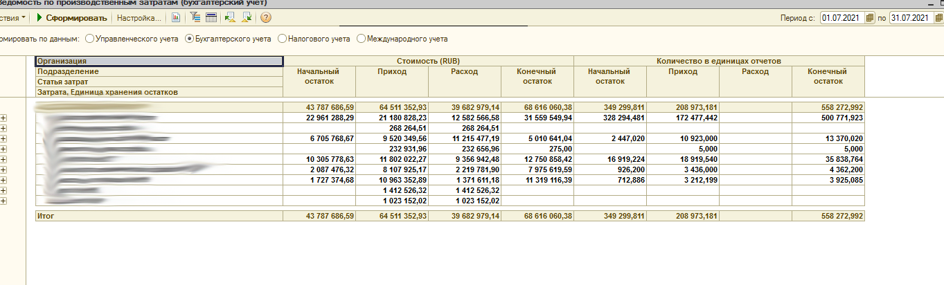 При закрытии июля, в ведомости по производственным затратам обнаружили след. проблему - отсутствуют списания расчетом себестоимости количества, при том, что суммы списываются. В других месяцах - до и после - все окей.