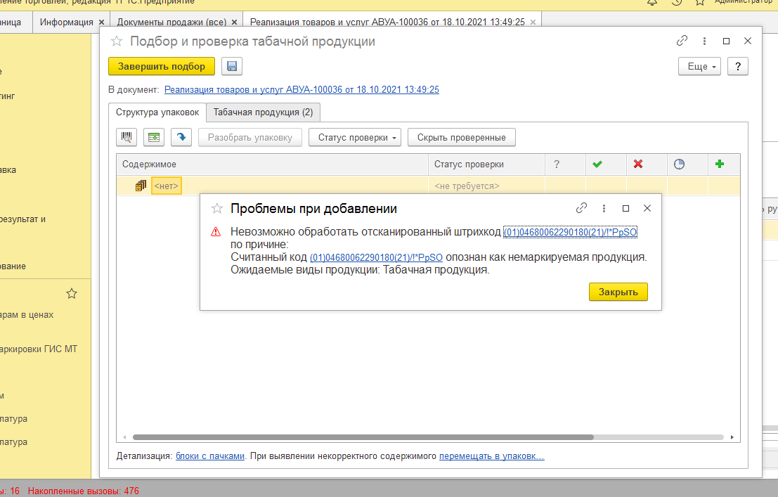 При добавлении маркируемого (по виду номенклатуры - он маркируемый!) товара в проверку-реализация (ут11,4), пишет, что ожидается вид - табачная продукция, хотя и вид - табак, и особенность учёта - есть, но... может с поступлением что то не так?, хотя до этого всё было норм, в общем надо смотреть.