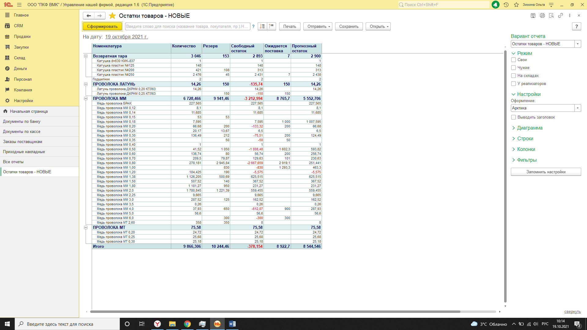 Свободный остаток – показывает сколько товара не хватает под потребности клиентов из расчета остатка на складе и резерва.