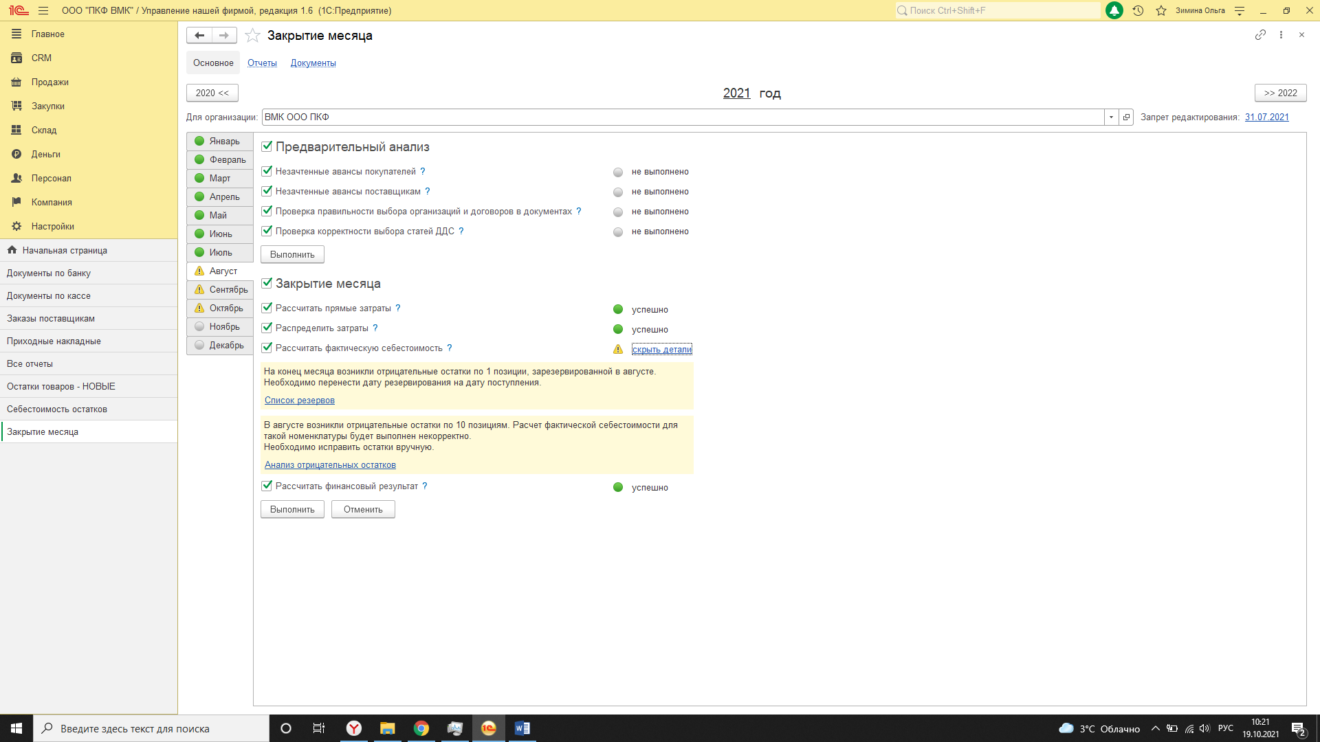 При закрытии месяца для расчета себестоимости продукции программа видит «минус» на складе.