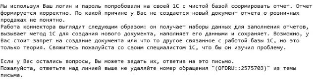 В компании JFD есть модуль "Сверка расчетов " с возможностью загрузки данных о розничных продажах в 1С . Этот модуль установили, настроили кассы в 1С. При загрузки данных из OFD должен создаваться отчет: ОРП - отчеты о розничных продажах. Отчет не формируются, почти целый месяц специалисты OFD решали эту проблему, потом сообщили, что у них эта обработка работает хорошо. Еще сказали, что настройках 1С есть функция, которая не позволяет создавать отчеты ОРП. Задача найти эту настройку и устранить проблему.