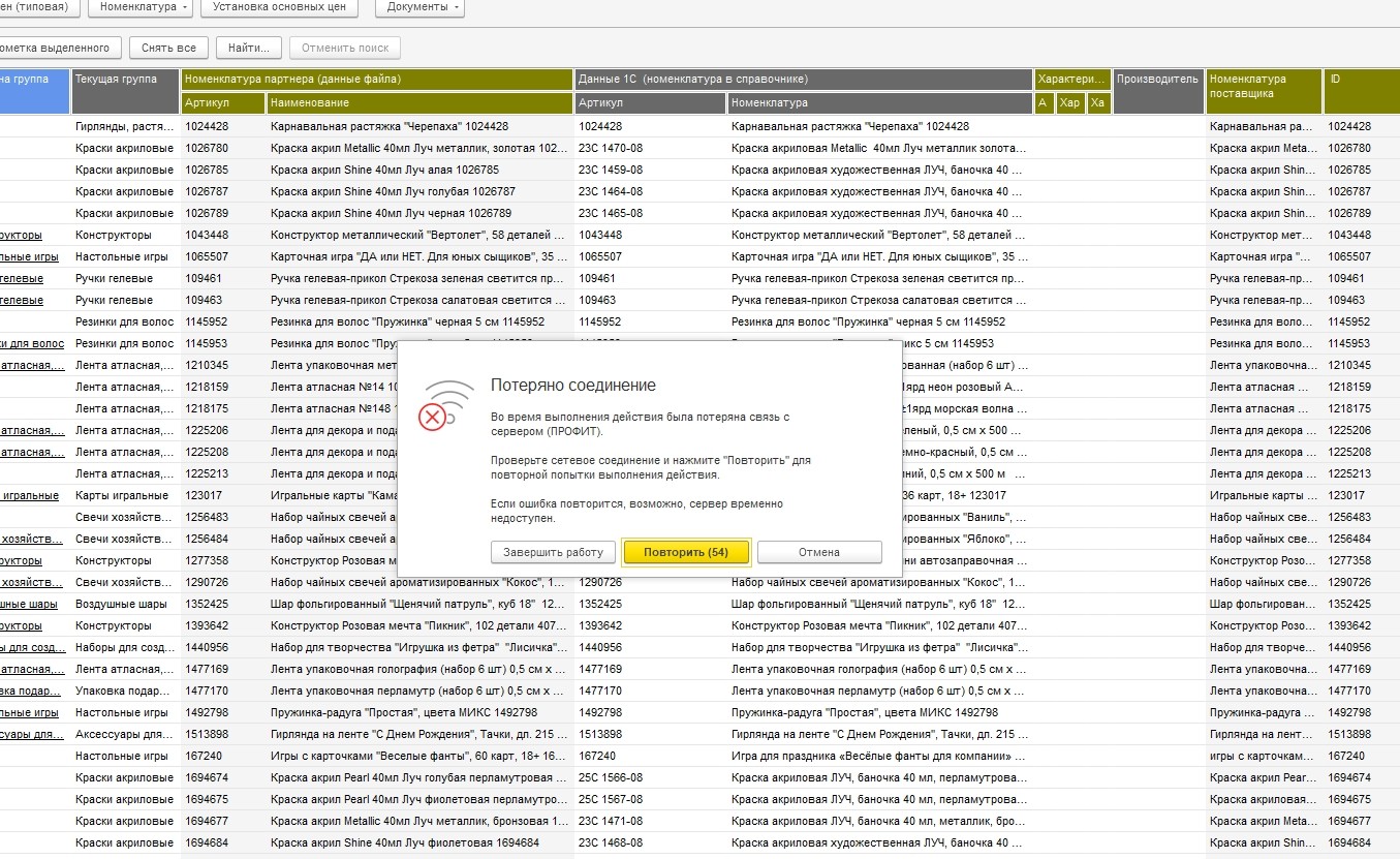 После зависания либо продолжает работать либо выдает сообщение потеряно соединение (во время выполнения действия потеряна связь с сервером, хотя я работаю за ним локально) после нажатия повторить работа продолжается.