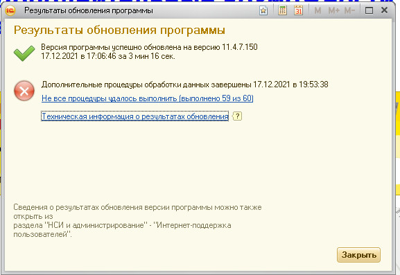 При обновлении на версию УТ 11.4.7.150 не все процедуры удалось выполнить выполненно 59 из 60 процедур, нужно исправить ошибку и завершить обновление