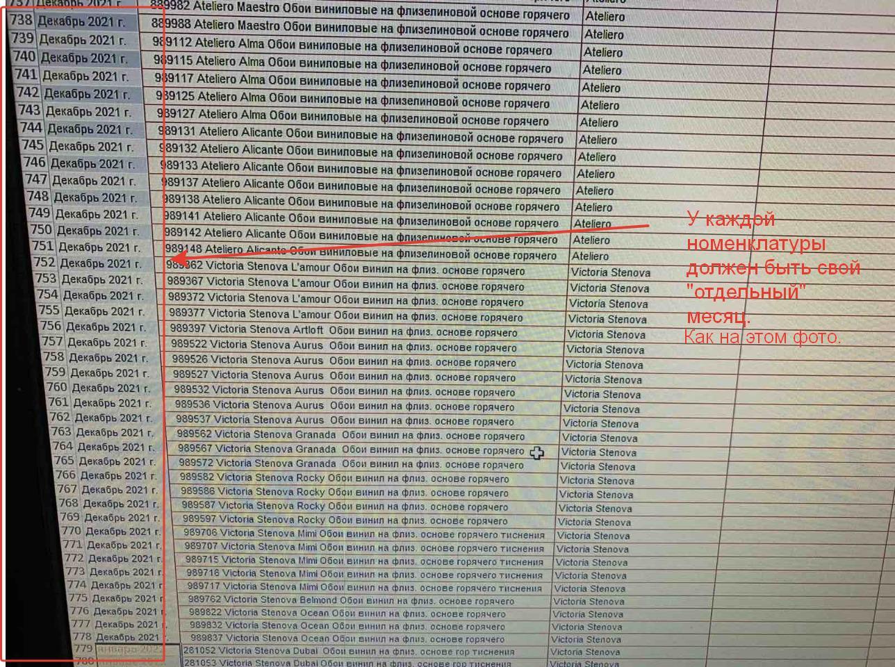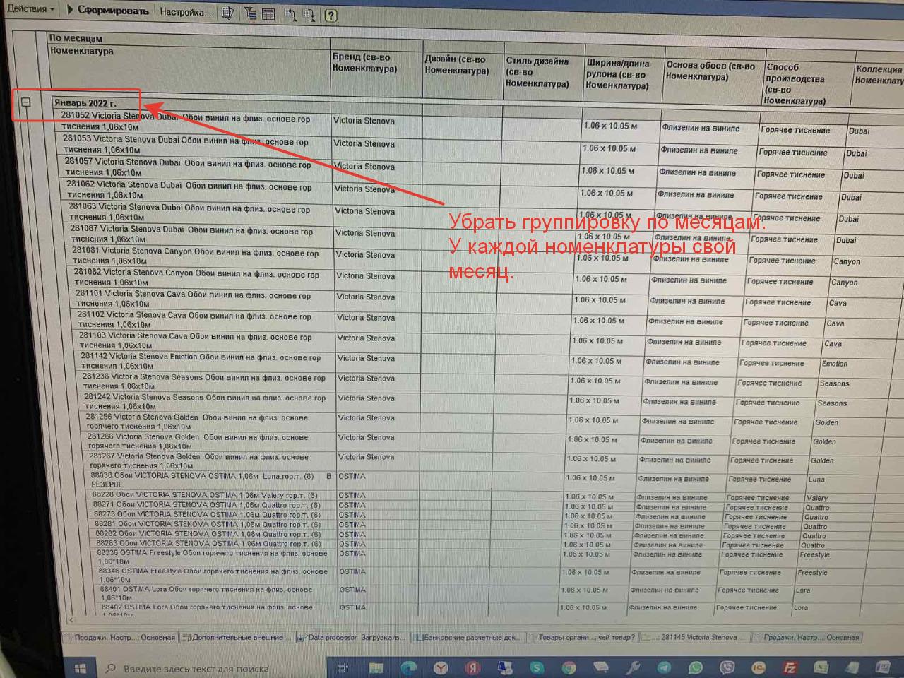 В отчете нужно убрать "группировку" по месяцам. Отчет разделяет номенклатуру по месяцам, нужно что бы у каждой номенклатуры прописывался свой месяц (фото примеров прикреплены). Через "пользовательский режим" настройки отчета убрать группировку возможности нет.