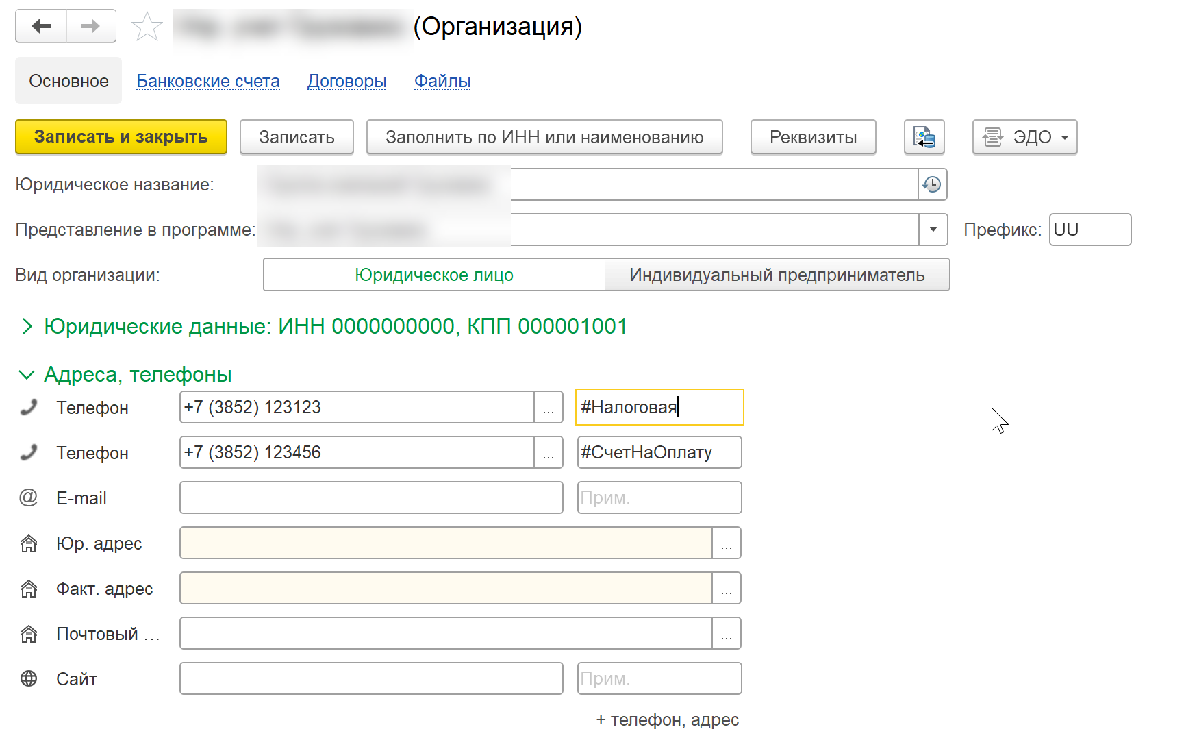 Для организации добавлено два телефона с примечаниями #Налоговая и #СчетНаОплату, см. Скрин001.