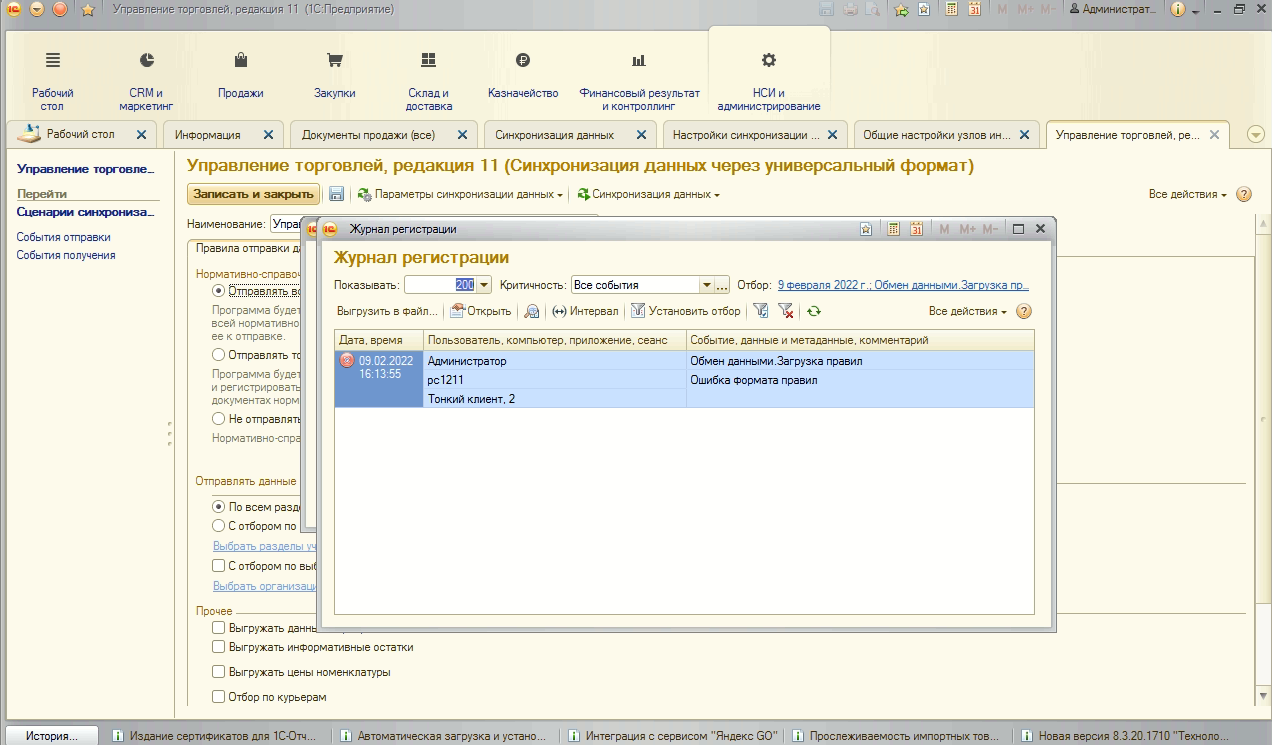 Скорее всего проблема в том, что при попытке обмена, какие-то данные не соответвуют формату. Не правильно заполены. Могу посмотреть, но стоимость огласить смогу только после осмотра. Всё зависит от масштабов проблемы. Бывает, что всего один элемент мешает.