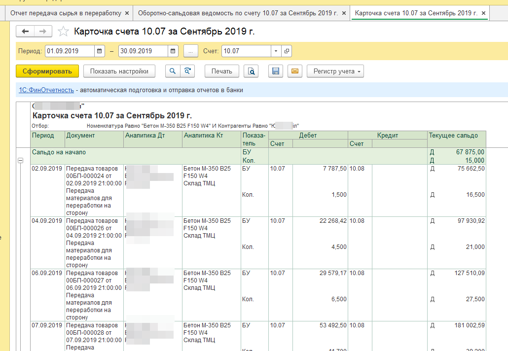 Переделать отчет на СКД "Передача сырья в переработку" по счету 10.07
