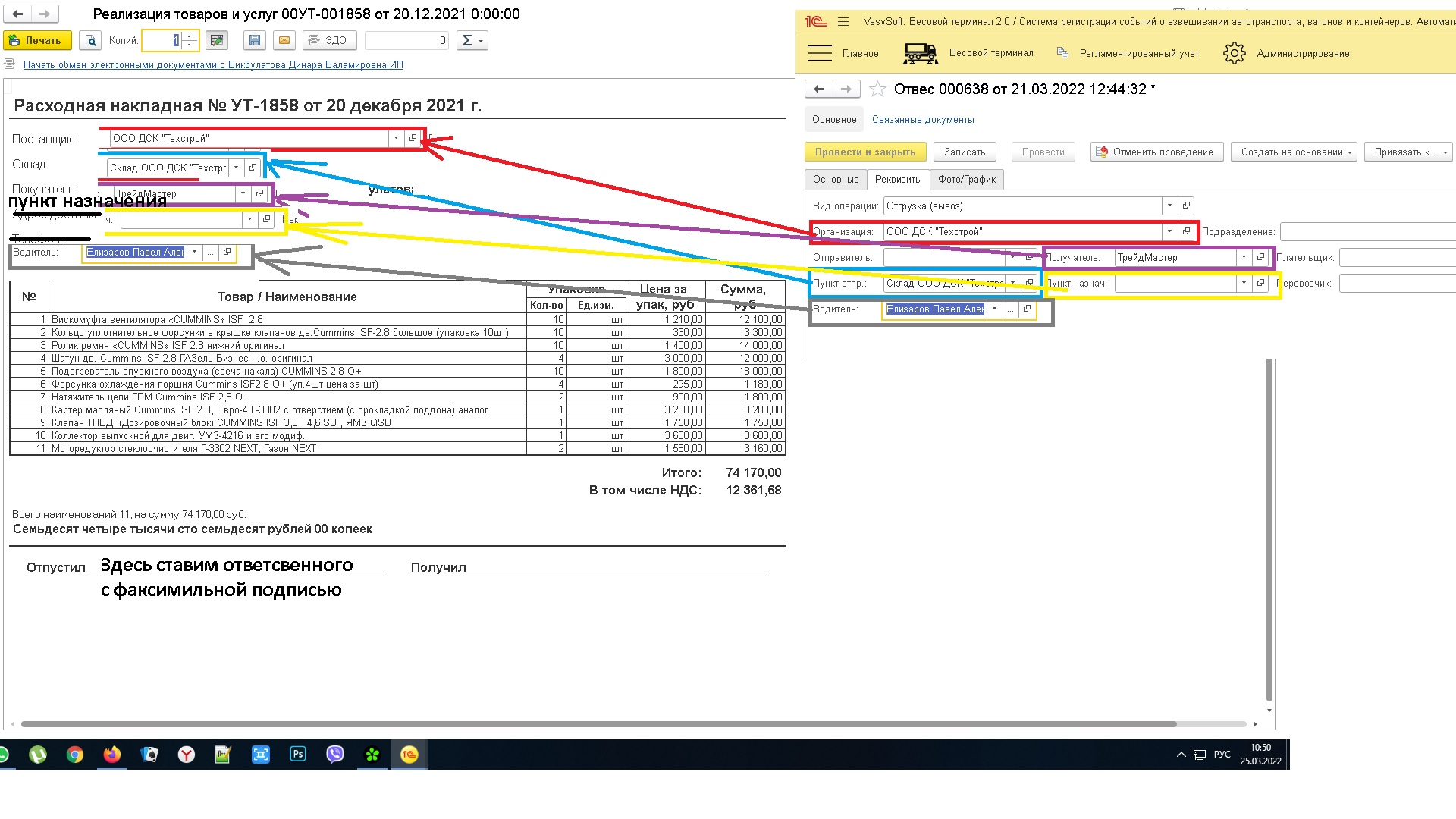 поле «Адрес доставки» переименовать в «Пункт назначения»— данные чтоб брались из документа отвеса поле «Пункт назначения»,