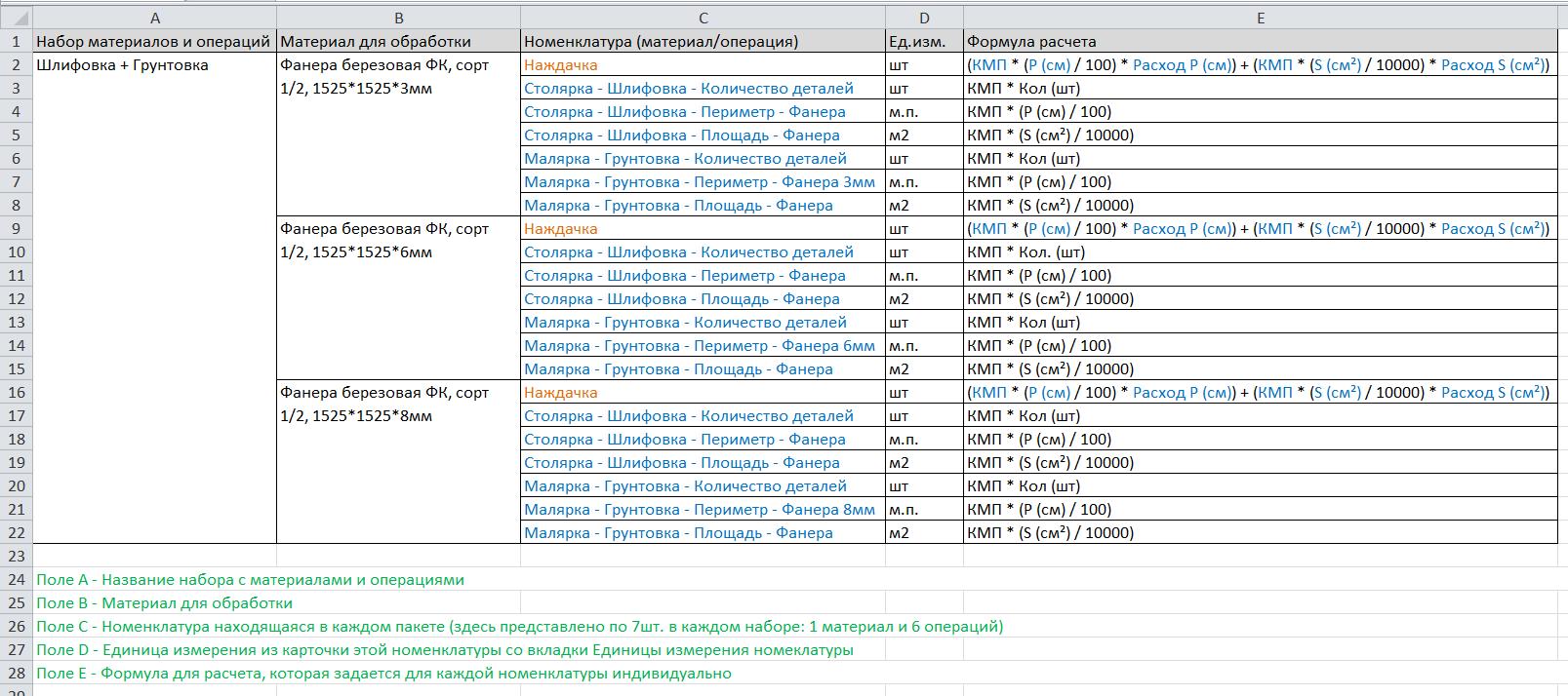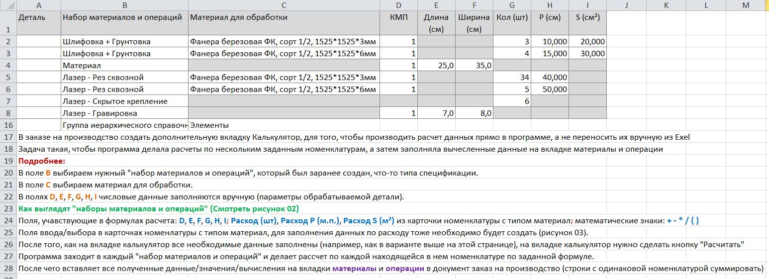 Задача такая, чтобы программа делала расчеты по нескольким заданным номенклатурам (по заданной формуле), а затем заполняла вычисленные данные на вкладке материалы и операции