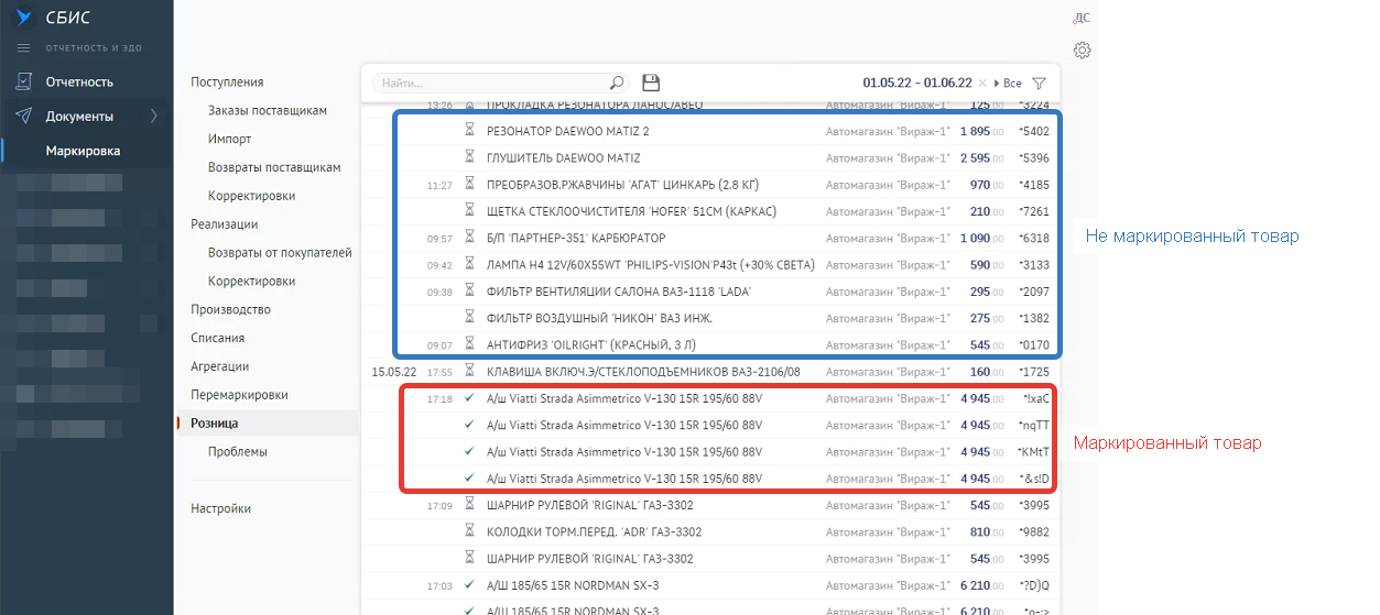 После этого стало происходить следующее, каждый раз при использовании при продаже сканера штрих-кода в СБИС стал прилетать не только маркированный товар, но и обычный товар - при этом маркированный товар после обмена с Честным знаком помечается как подтвержденный, а остальной товар висит там со статусом на проверке.