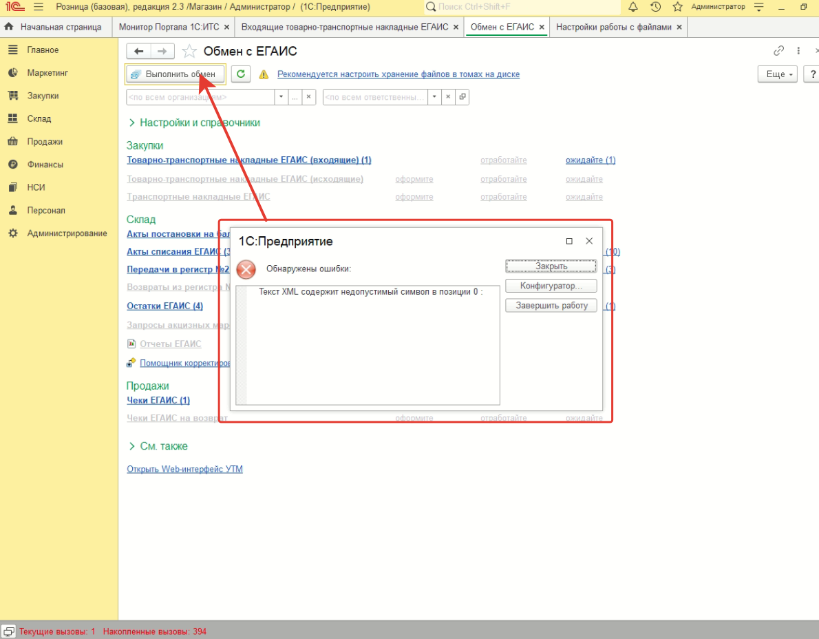 При нажатии кнопки "Обмен" ЕГАИС\\\'а, появляется "...Непредвиденная ошибка...".