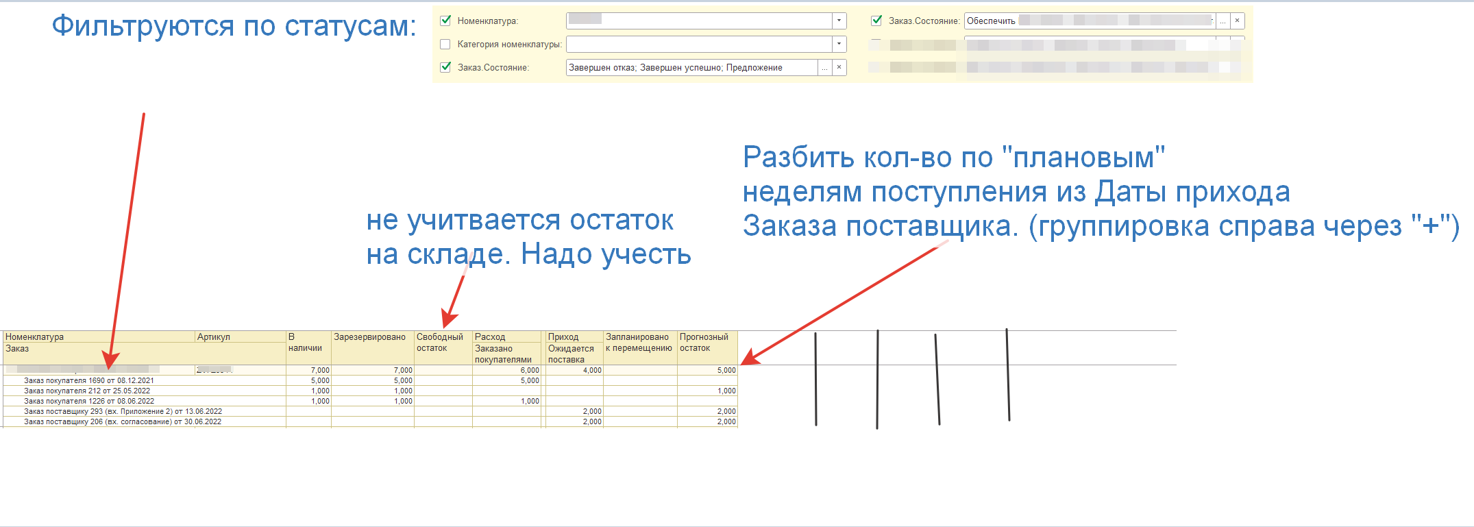 Общая цель отчета: Понимать плановую ситуацию по группе номенклатуры. Товар идет под заказ долгими поставками 10-12 недель. И зачастую часть товара «в пути» на наш склад уже продана. (Ставятся резервы в отдельных строках в «Заказе Поставщику»)