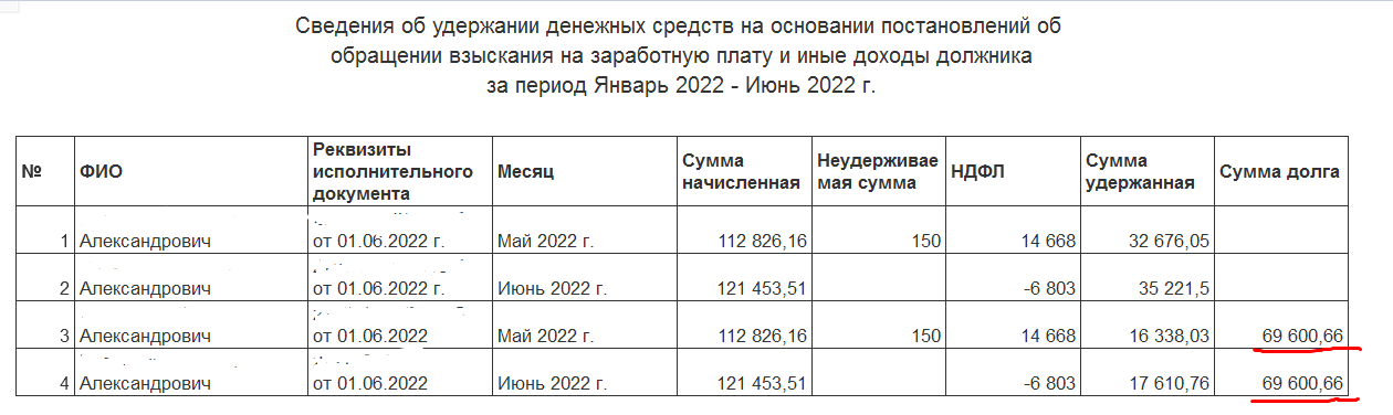 Есть внешний отчет, который собирает данные по исполнительным листам. Сделан был на основе штатного "Карточка учета исполнительных документов с оплатами". В отчете есть ошибка, которую надо устранить. Если, в исполнительном листе есть есть ограничение до предельной суммы удержания, то в поле "Сумма дога" выводится сумма на конец периода формирования отчета. А надо, чтобы сумма долга отображалась помесячно. Картинка отчета в прикрепленном файле.