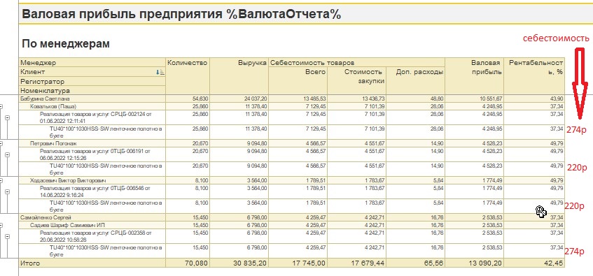 При закрытии месяца обнаружили что в июне имеются продажи с разной себестоимостью. Товар был продан с одного склада, но фирмы разные. Каких-либо поступлений или перемещений в июне не было. Приход был один в апреле месяце. То есть, за май и июнь с этого склада были только продажи. В Мае себестоимость встает нормальная, а в июне уже косяк. Тестировали базу, распроводили и проводили заново все продажи, поступления и перемещения за апрель-июнь, перерассчитывали себестоимость. Ничего не помогло.