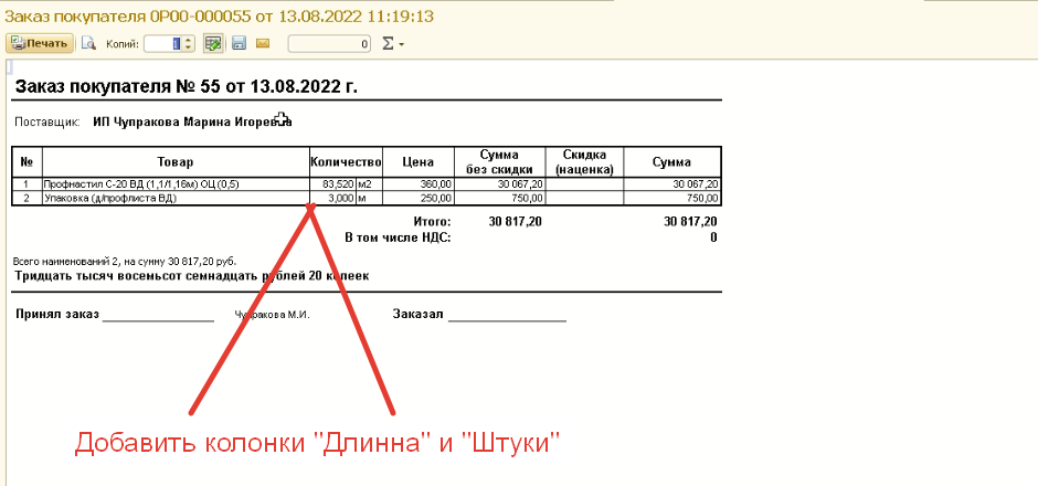 В печатную форму "Заказ покупателя", нужно вывести только две колонки: "Длинна" и "Штуки".