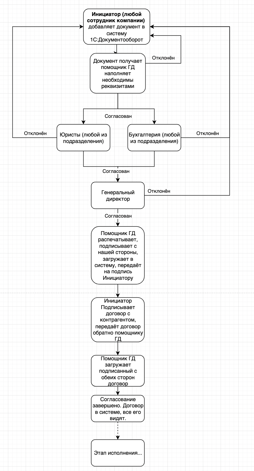 Добрый день, требуется настроить Документооборот стандартными средствами, пока требуется процесс инициации и согласования до подписи с обеих сторон в бумажном виде. Схема процесса может обсуждаться с исполнителем и модифицироваться из опыта. Следующим этапом потребуется этап исполнения.