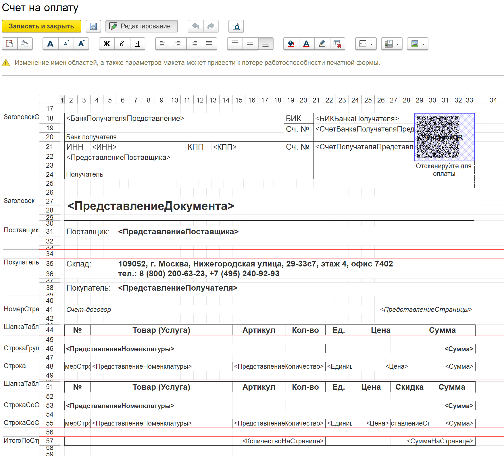 В программе есть возможность редактирования печатных форм. (через меню Настройки-Администрирование-Печатные формы, отчеты и обработки). При изменении печатной формы выводится табличный интерфейс, в котором можно менять параметры ячеек.