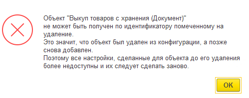 Текст ошибки: Объект "Выкуп товаров хранителем (Документ)" не может быть получен по идентификатору помеченному на удаление. Это значит, что объект был удален из конфигурации, а позже снова добавлен. Поэтому все настройки, сделанные для объекта до его удаления более недоступны и их следует сделать заново."