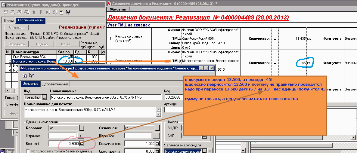 т.е. в доке колво одно, а при проведении делится на вес из ед. изм.