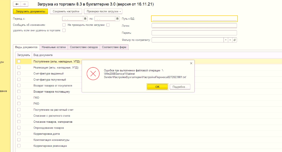 Сменили сервер, при попытке сохранить настройки в обработке, пишет ошибку.