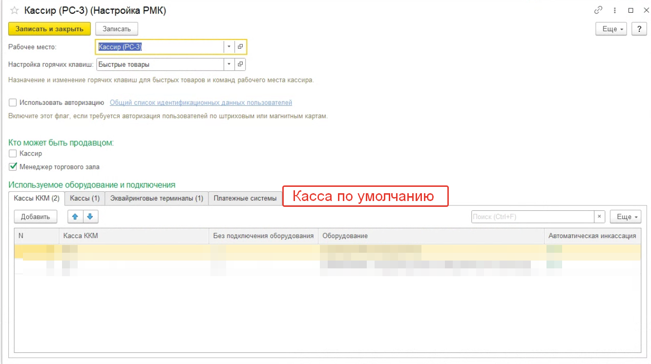 Цель: при каждой продаже в РМК спрашивать через какую кассу ККМ пробить чек с возможностью указать для некоторых видов оплат кассу ККТ по умолчанию.