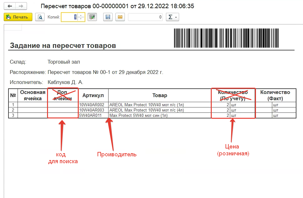 3. Бланк задания на пересчёт товаров (с ячейками)