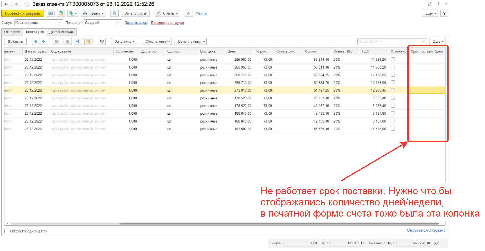 УТ 11.5 - не работает колонка со сроком поставки