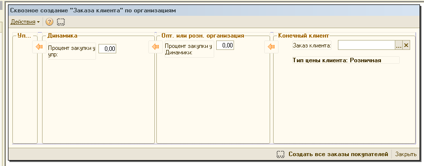 Порядок работы следующий: менеджер вводит документ "Заказ покупателя" (стандартный). Далее запускает обработку. Выбирает в ней созданный заказ. Указывает процент уменьшения цены при закупке у Динамики (по умолчанию 4%), указывает процент уменьшения цены при закупке у упр. организации (по умолчанию - 6%).