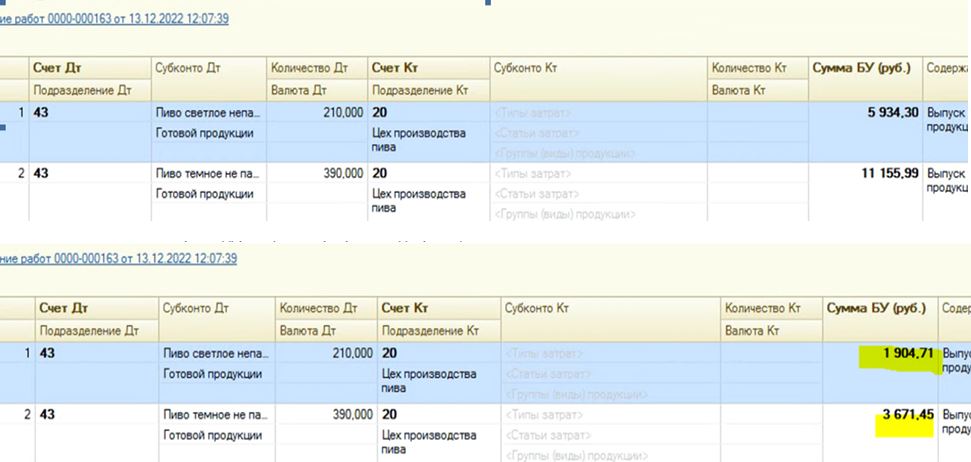 После этого производственные документы стали формировать ошибочные суммы. В частности документ ВыпускПродукции