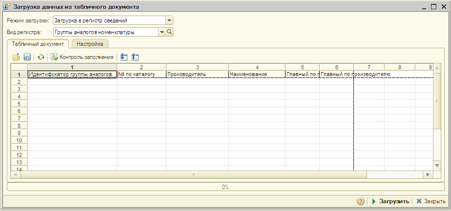 Создание новых аналогов стандартным способом производится обработкой: Обработки->Загрузка данных из табличного документа