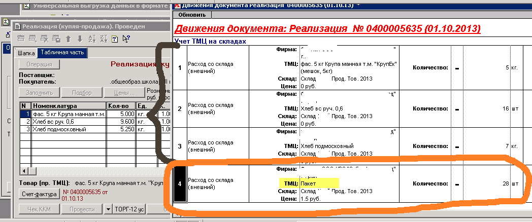 Ссуть: весь товар передаваемый в розницу или продавая укладывают в пакеты. В самих докумеyтах пакет не указывается, а списывается фоном по хитрому расчету.