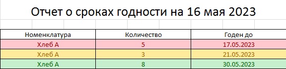 К примеру, есть Хлеб А, срок годности 20 дней; приходы 27 апреля - 5 штук, 1 мая - 3 штуки, 10 мая - 8 штук. Значение "Предупреждать за" - 5 дней. Вид отчета (приблизительный) в приложенной картинке