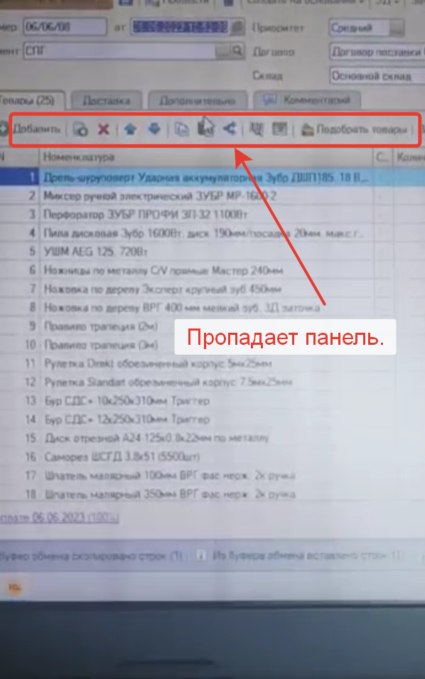 После обновления платформы, в документах, в табличных частях товарах, где есть кнопки (скопировать, добавить и т.п.), пропадает панель, когда взаимодействуешь с "бегунком". Фото примера пропажи панели прикрепляю.