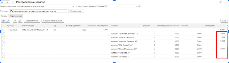 Создана операция распределения запасов “Распределить поровну до рекомендованного остатка”, с помощью которой можно распределить запасы поровну между магазинами, но не более значения “Рекомендованного остатка”.