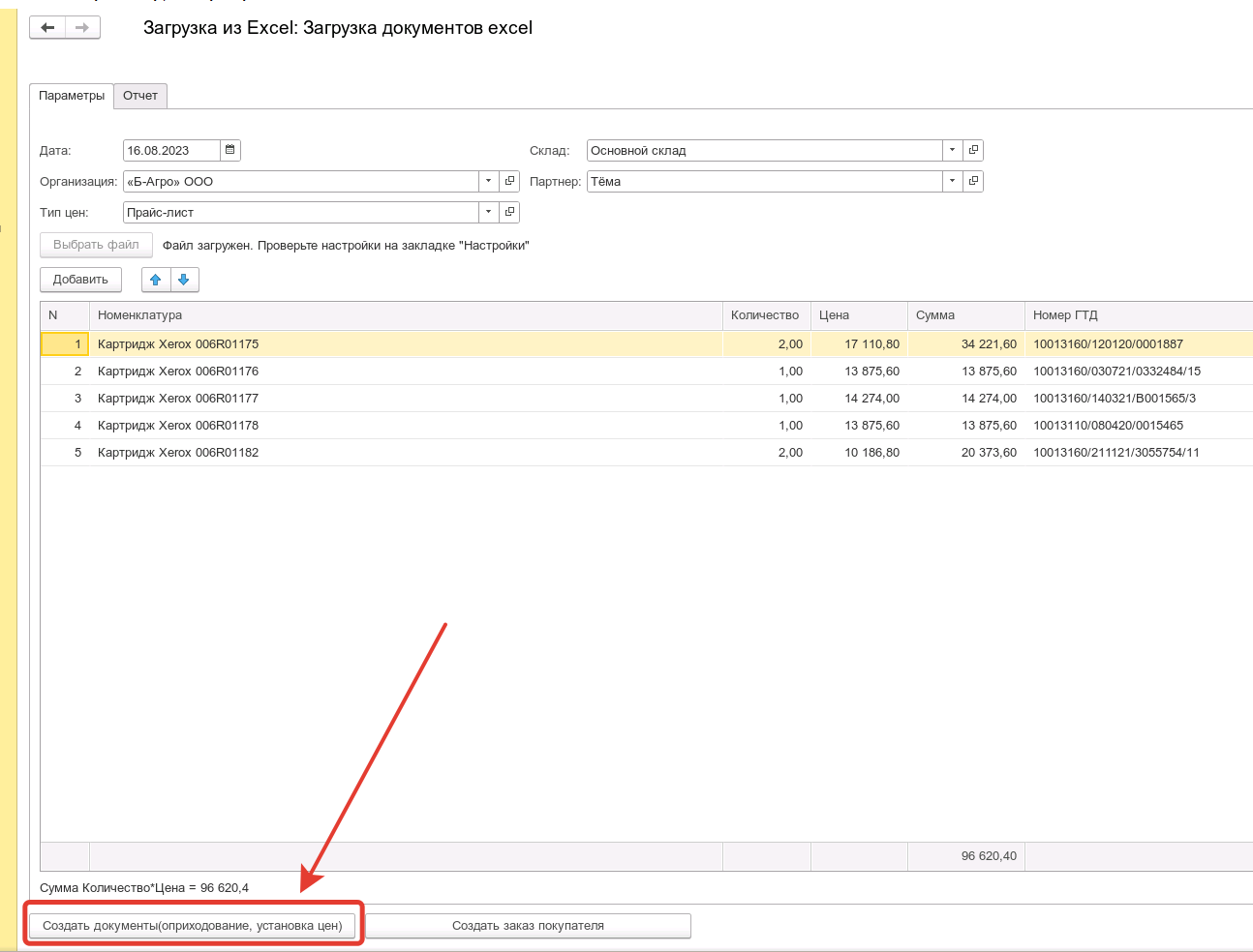 Есть обработка, загрузка данных из excel. Она отрабатывает, подгружает документы, создается документ "Приобретение товаров и услуг".