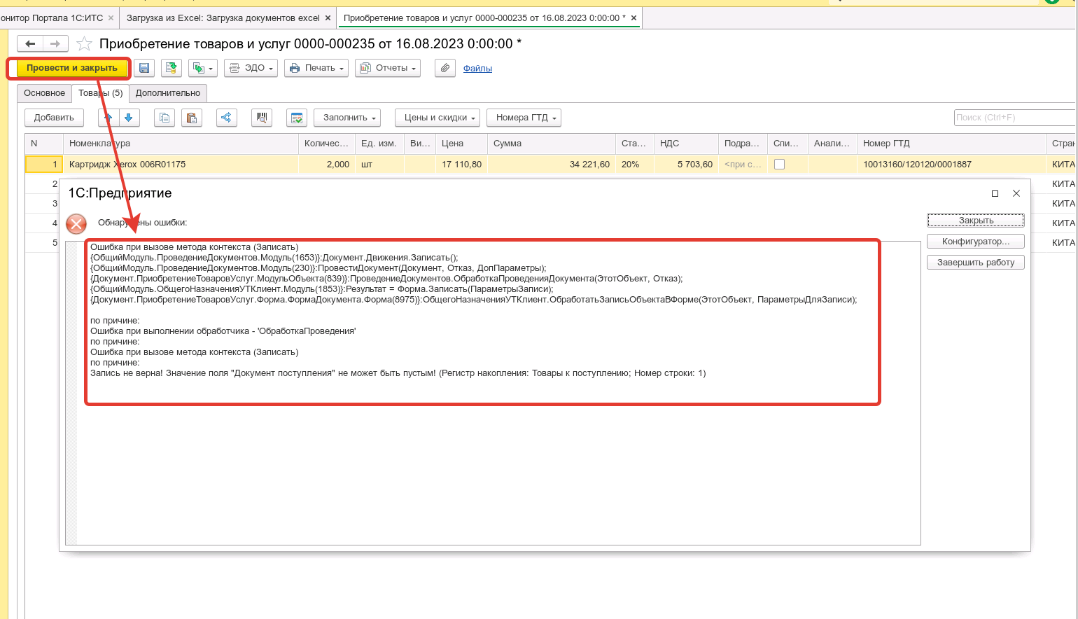 При нажатии кнопки провести в документе "Приобретение товаров и услуг", появляется такая ошибка: