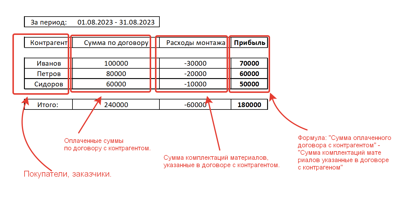 С каждым контрагентам заведен договор, в котором указывается сумма оплаты, сумма комплектации материалов.