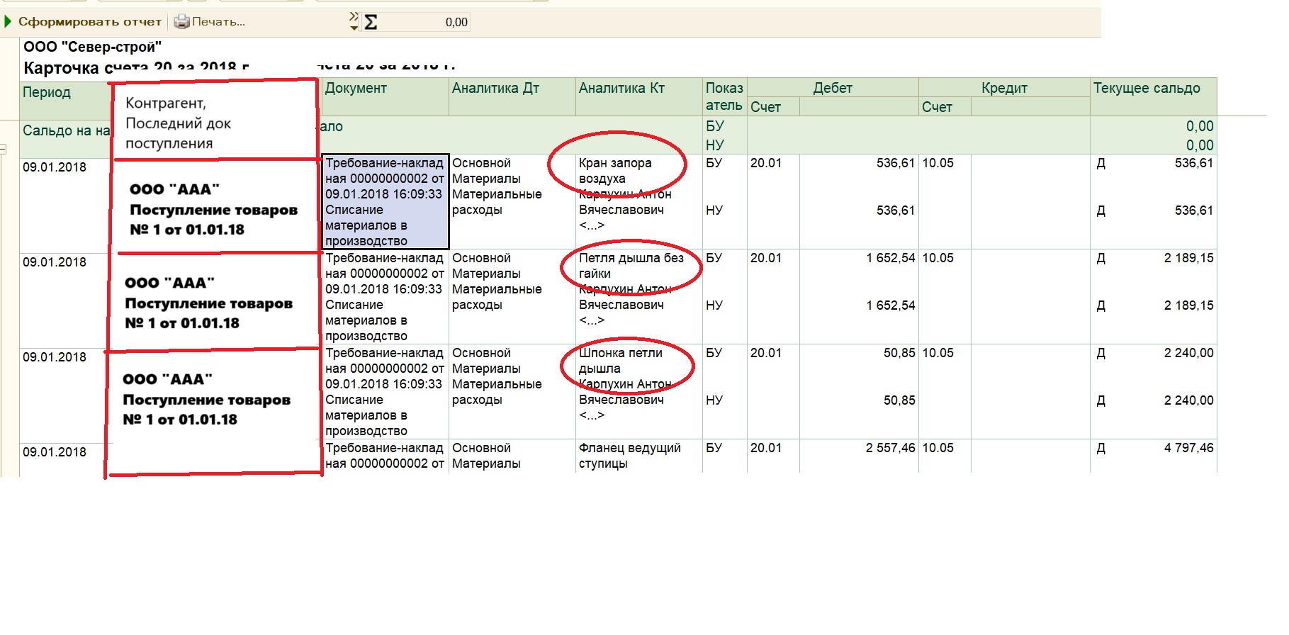 Там, где в столбце "Документ" выходит "Требование-накладная", нам нужно в нашей колонке вывести контрагента и документ поступления, по которым последним поступил материал в этой строке на дату требования-накладной.
