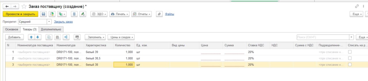 В итоге: открываем внешнюю обработку, выбираем заказ на эмиссию, ставим цену закупки. Нажимаем записать, всплывает сообщение, что создан заказ поставщику. Далее в заказе поставщика заполняется дата, товары и цена (цена у всех товаров одинаковая и включает НДС)