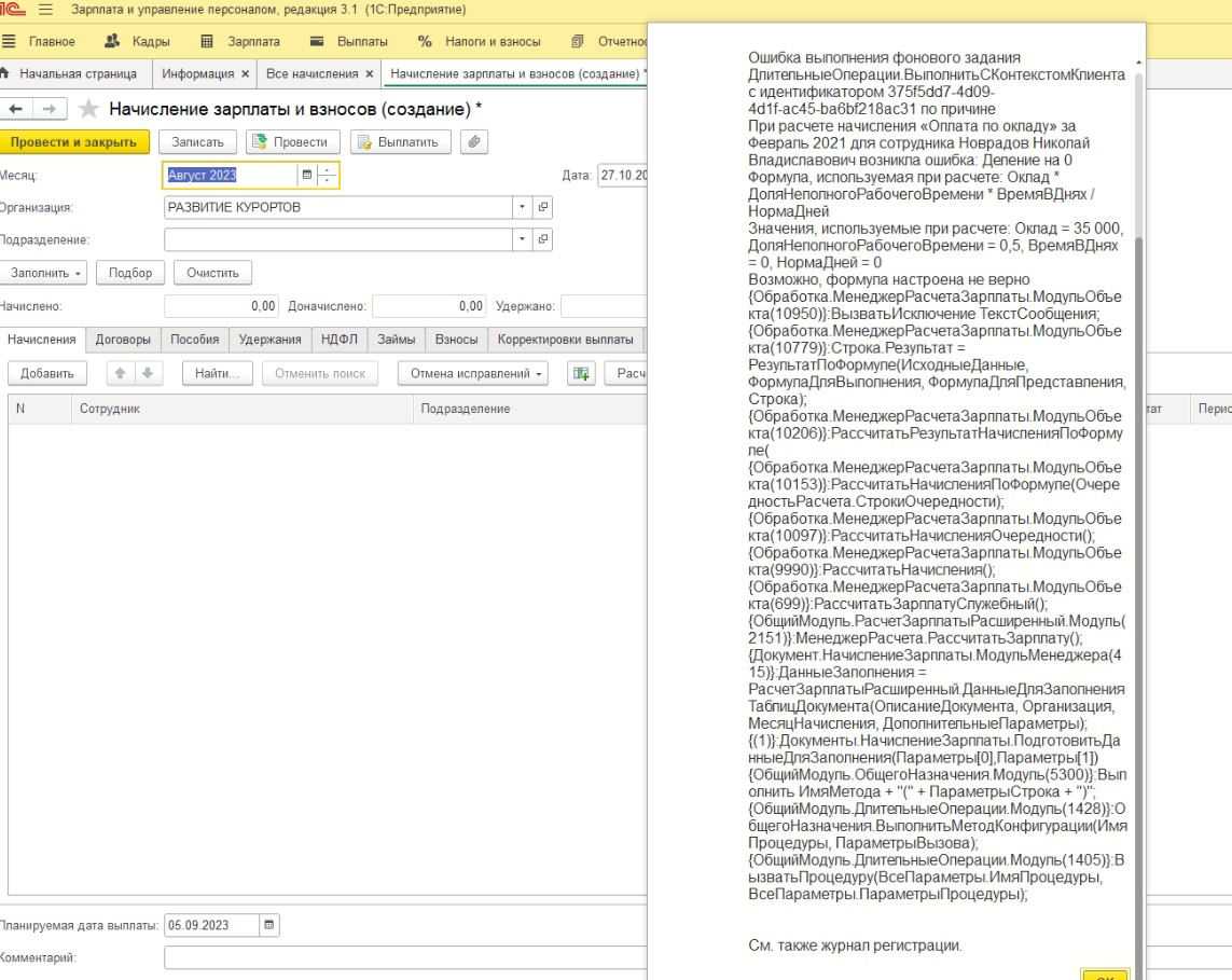 Есть типовая ЗУП 3.1. Есть проблема в начислении зп и взносов. Ругается на деление на 0 (ВремяВДнях = 0 и НормаДней = 0),