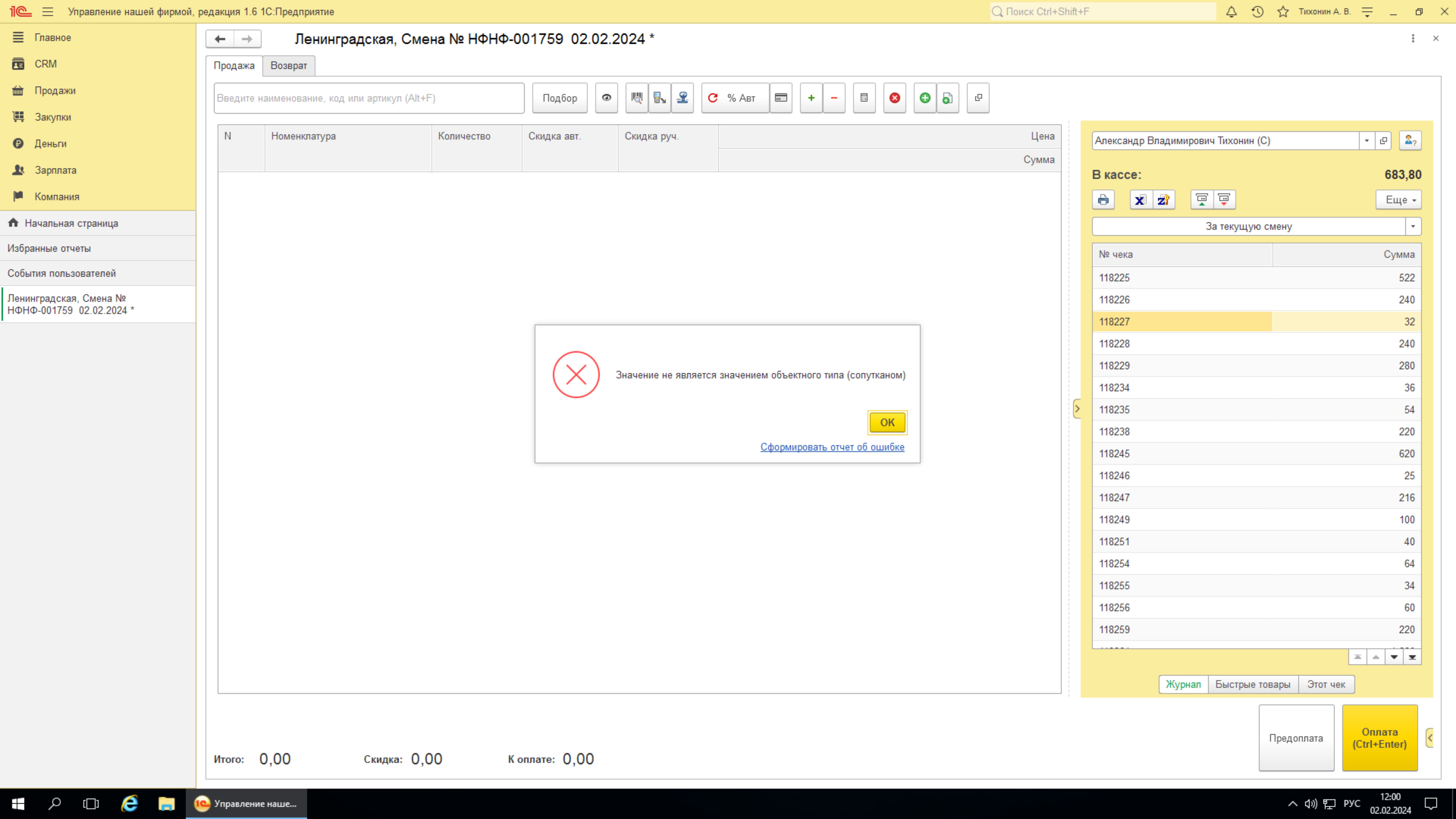 Так же у нас есть ошибка при удалении всех товаров в РМК из чека. Скрин приложил. Ее нужно пофиксить