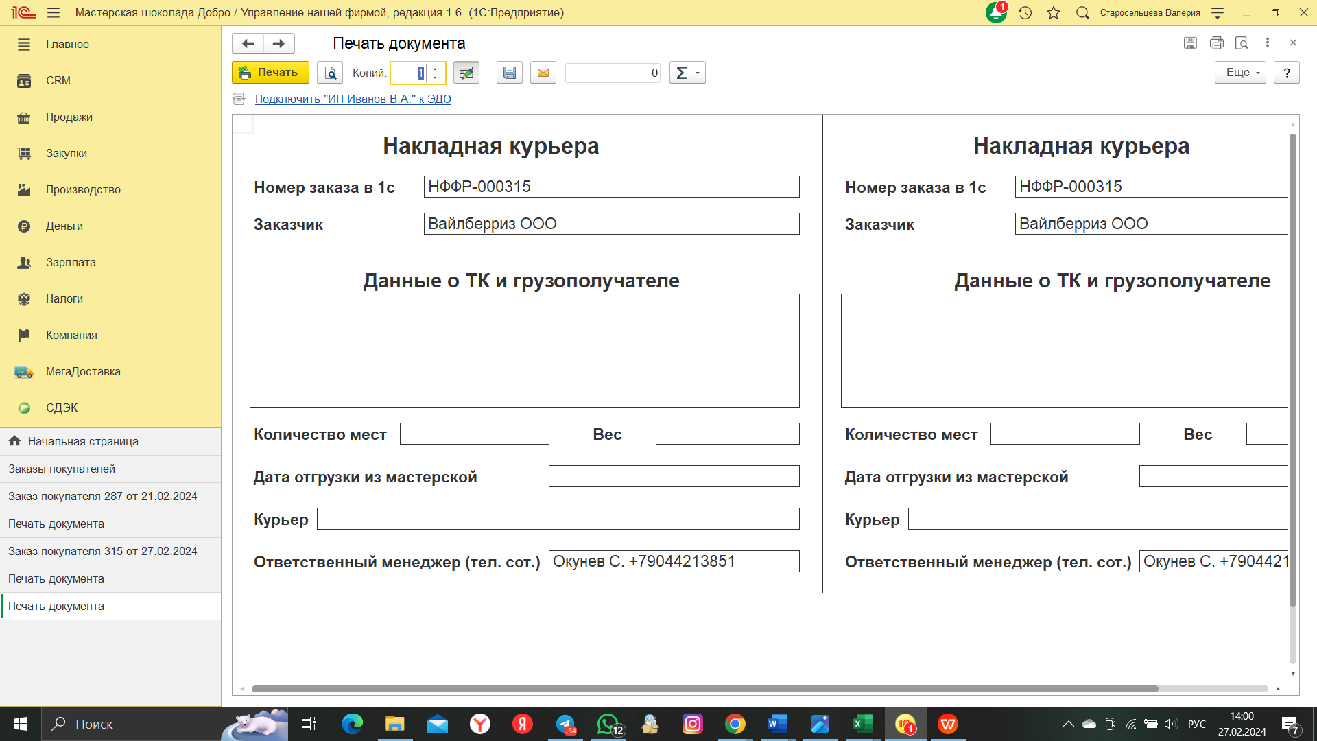 Формирование сборочного листа заказа (скрин прилагается); формирование накладной курьера (скрин прилагается); формирование сдельных нарядов по тарифам из справочников.