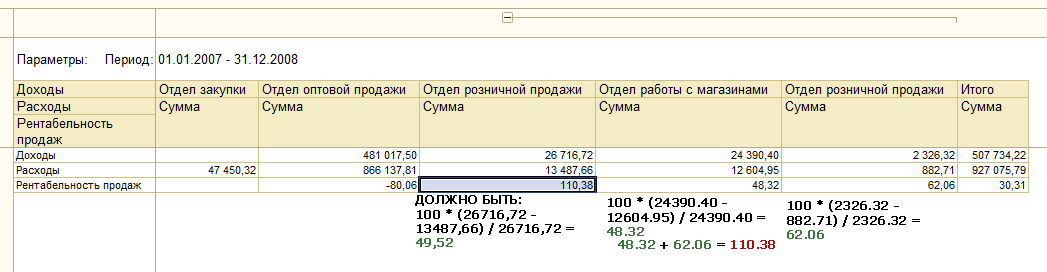 Для подразделений все отлично рассчитывается. А вот группировка суммирует получившиеся проценты. Это неправильно.