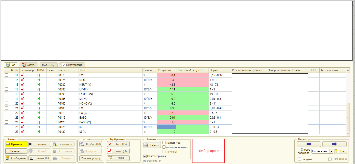 Добавление кнопки "Подбор крови" в основную форму ЖОЗ, которая будет видима и доступна только при наличии определенных тестов в заказе.